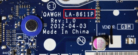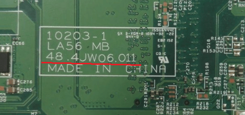 Сведения о моделях платформы Wistron находятся внутри небольшого белого прямоугольника. Здесь показан фрагмент материнской платы Wistron LA56. Две оставшиеся строки с числами – это версия и партномер материнки (начинается с 48). Если у модели есть словесное название, оно указано первой строчкой.