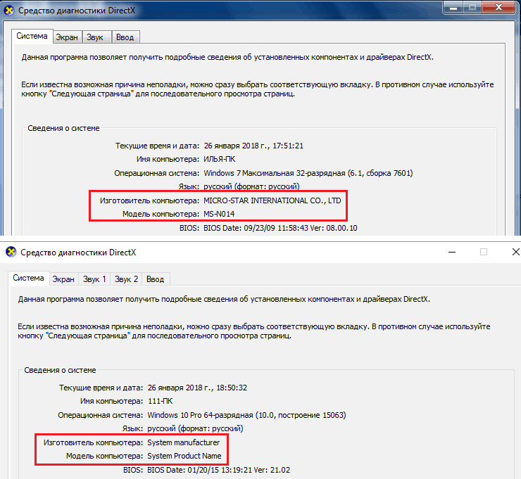 Для запуска «Средства диагностики DirectX » снова откроем виндовый поисковик и начнем вводить команду dxdiag . Интересующие нас сведения тоже находятся на основной вкладке приложения. Это «Изготовитель компьютера » и «Модель компьютера ».