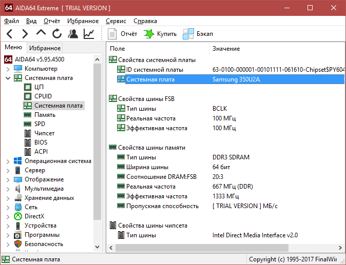Еще одним хорошим диагностическим приложением для компьютера является AIDA64, но его минус, в отличие от CPU-Z, что оно распространяется платно. При этом с сайта разработчиков можно загрузить пробную 30-дневную версию бесплатно, которая позволит узнать данные о материнской плате, установленной в компьютере.