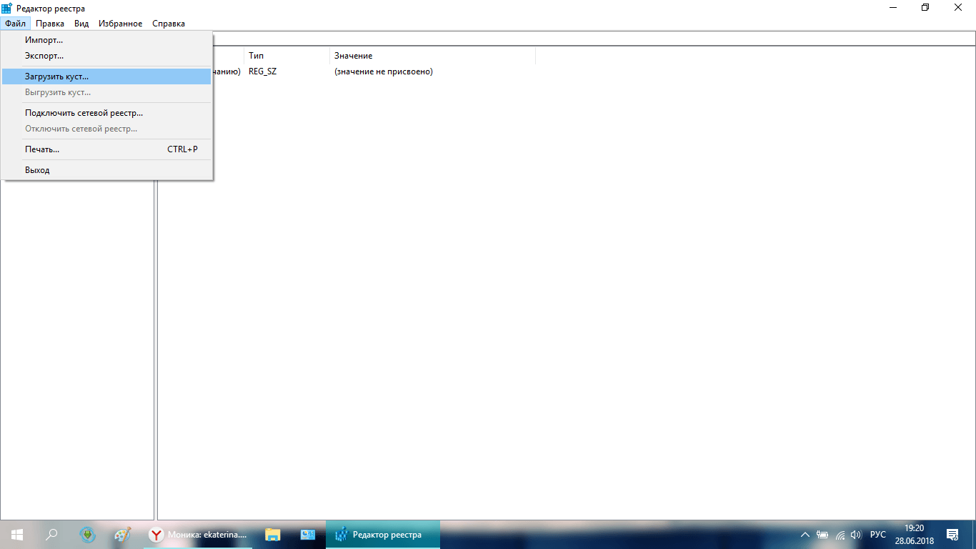 Кликните по папке HKEY_LOCAL_MACHINE в левой части окна - Теперь переключаем своё внимание на верхнюю панель окна и жмём на «Файл», а потом на «Загрузить куст».