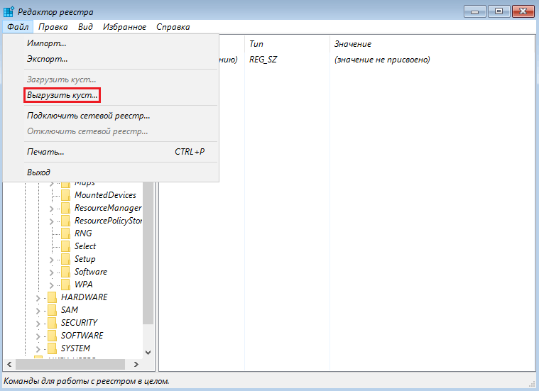 - В левой части окна кликните по созданному вами ранее разделу левой кнопкой мыши. Теперь нажмите на «Файл», а затем на «Выгрузить куст». После этого подтвердите своё действие.