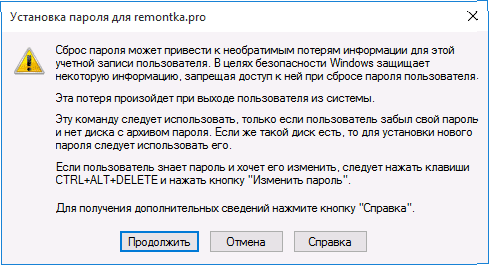 Сделайте клик правой кнопкой мышки по нужному имени пользователя и в меню нажмите на пункт «Задать пароль». Появится окошко с предупреждением (изучите, что в нем написано) и сделайте клик по кнопке «Продолжить».