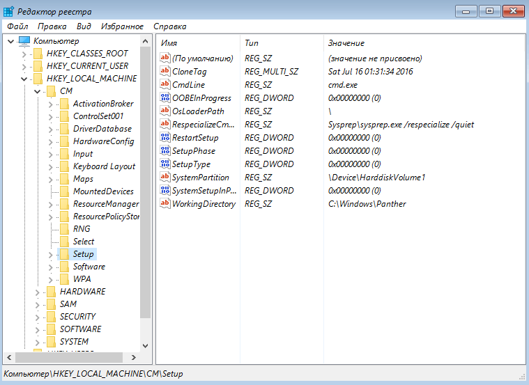 Измените значение параметра CmdLine на cmd.exe - В перечне находим также пункт SetupType, открываем его и ставим значение 2.