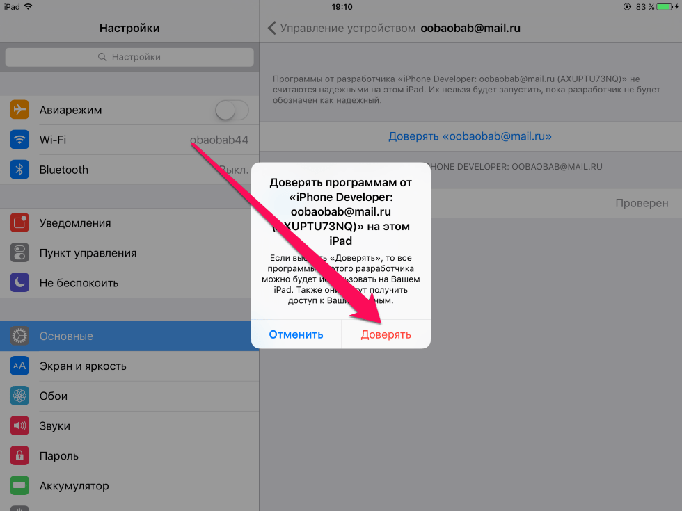 11. Откройте Настройки -> Основные - Управление устройством и выберите имя введенной вами учетной записи, а затем Доверять ИМЯ учетной записи и подтвердите выбор.